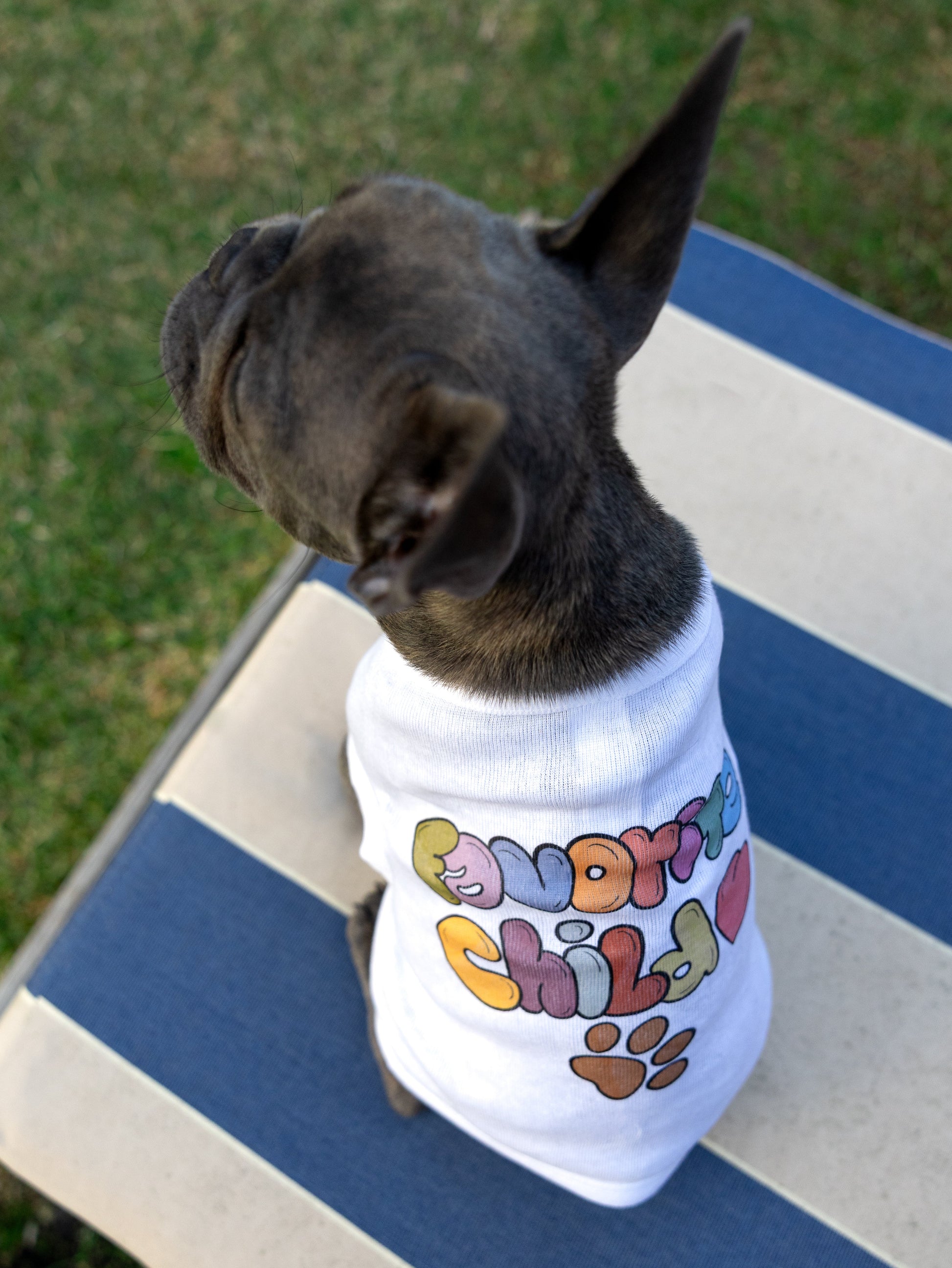 The Favorite Child dog tee is part of the Zoe’s Pack collection, an artist-designed line for North Shore Girls inspired by Zoe the Frenchie. This piece features an original hand-drawn design with multi-colored lettering and a paw print motif.